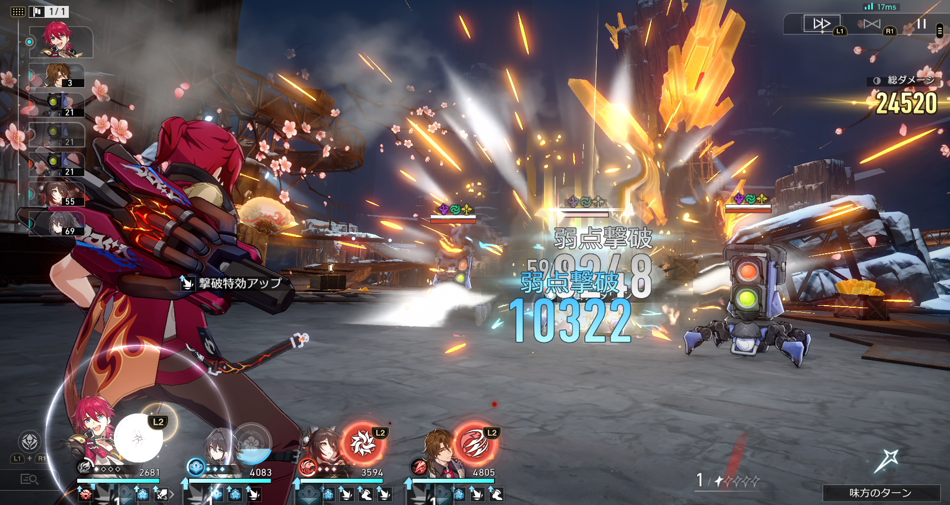 戦闘では、敵の靭性ゲージを削ることで「弱点撃破」が可能となり、敵に行動遅延や被ダメージ増加などのデバフ効果を与えることができる。